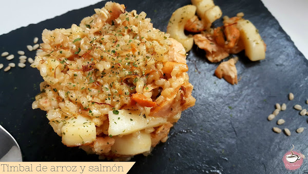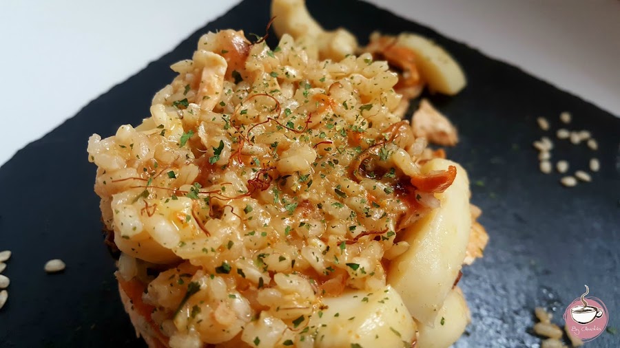 Ahora casi no salgo de ahí. ¡¡Qué producto!! La semana pasada compré salmón y unos calamares y como me había limpiado muy bien la espina de un lenguado que hice filetes pues la aproveché para preparar un fumet. El caso es que olía taaaaaan rico que cambié los planes de comida de ese día y la lié con este arroz que quedó de rechupete.