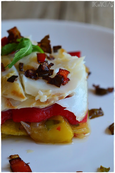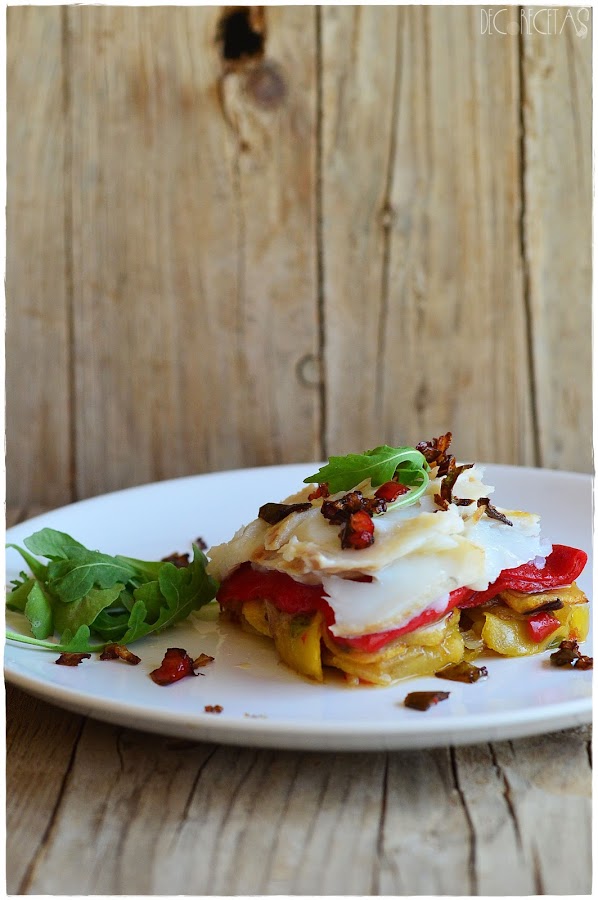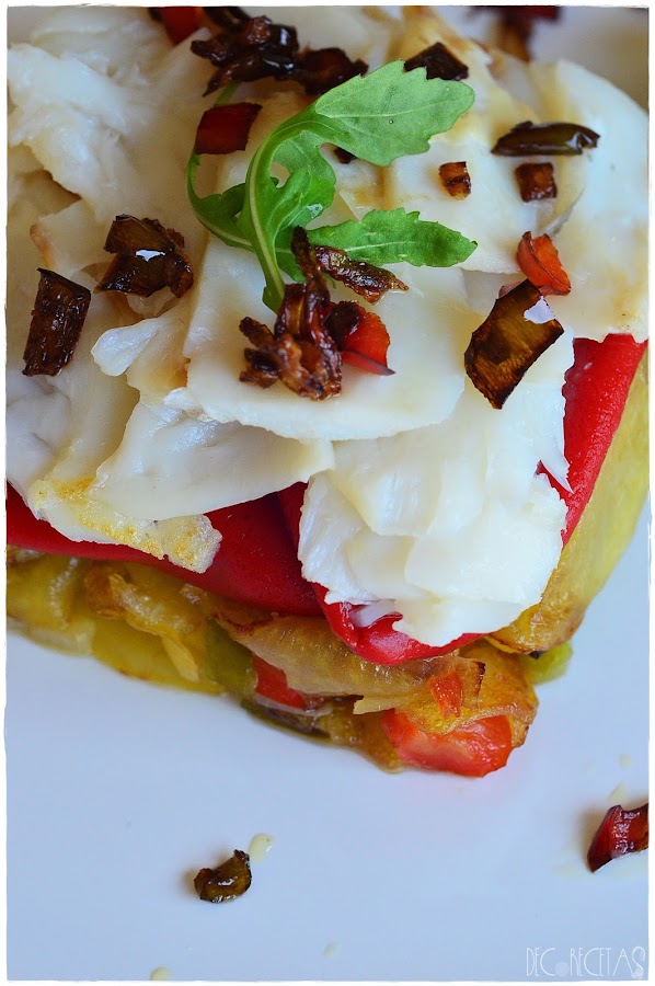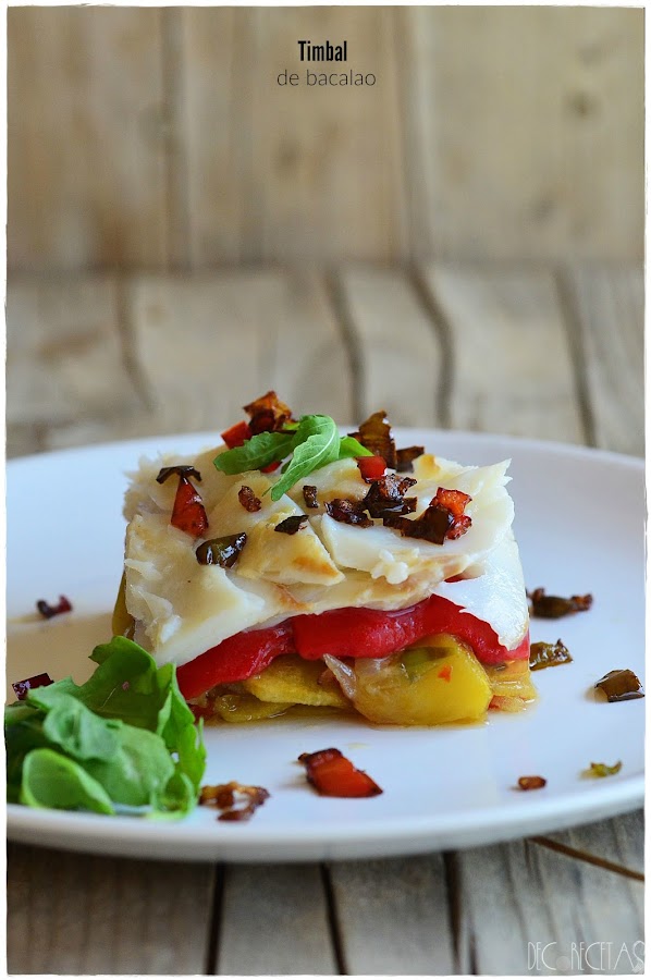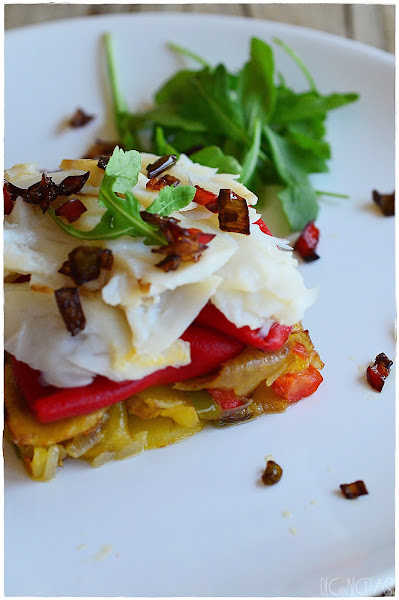 Estás patatas a lo pobre, simplemente son unas patatas cortadas en láminas finas que se fríen en aceite a baja temperatura junto con cebolla y pimiento verde y rojo. Son la base de nuestro timbal, puesto que encima colocaremos pimientos del piquillo y para culminar el plato láminas de bacalao que simplemente hemos pasado por la plancha. Por encima yo agregue trocitos de cebolla y pimiento de las mismas patatas y acompañe con rúcula
