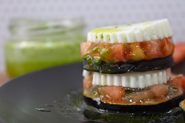 Cuando las berenjenas estén hechas, montar el timbal poniendo una rodaja de berenjena, tomate y queso, repetir dos veces y aliñar con una cucharadita de aceite de albahaca.