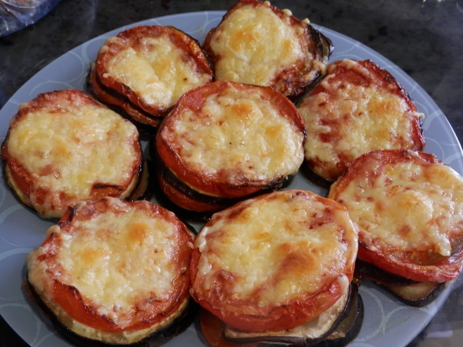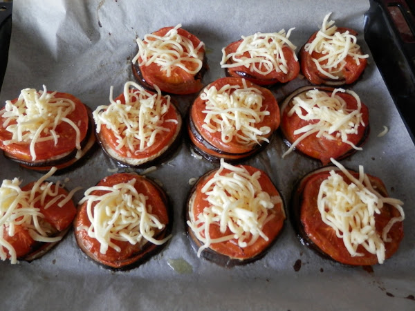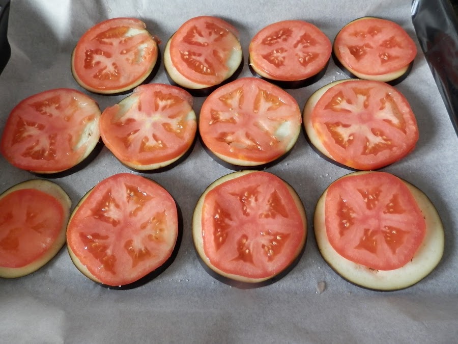 En una placa de horno, dispón las rodajas de berenjenas para después poner encima las de tomate y así haciendo el timbal.