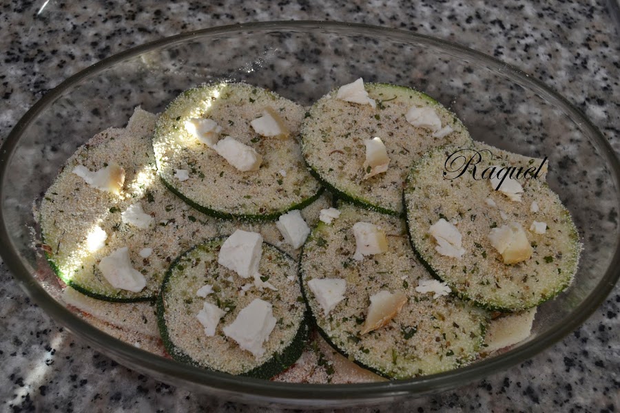 Y por ultimo otra capa de calabacín, con sal, pimienta, orégano y espolvorearemos un poco de pan rallado por encima, así quedara algo crujiente, yo le puse unos taquitos de queso de cabra y pensé que se deritiria pero no quedaron como unos picatostes de queso, que por cierto se los comió todos mi hija.