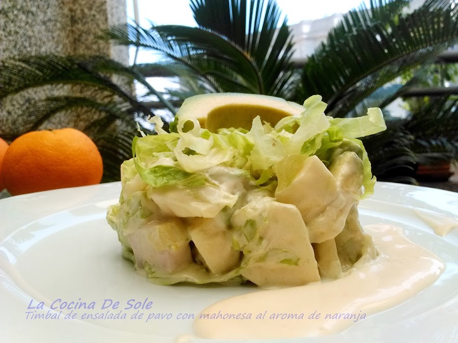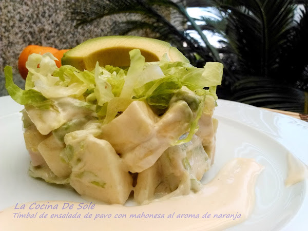 Ahora, en un bol, echamos los taquitos de pavo, el aguacate troceado y la manzana cortada a cubitos. Le añadimos la mahonesa de naranja y mezclamos.Ya está lista, la presentamos al gusto.