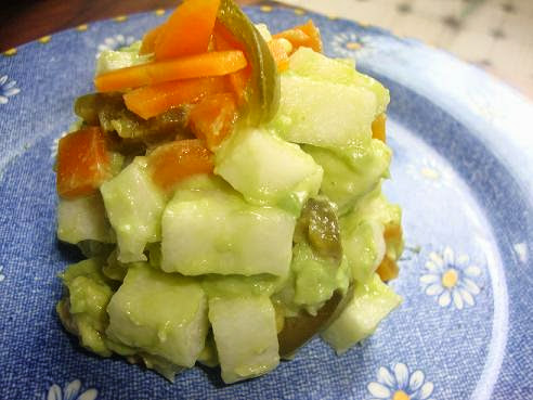 Cuando tengas picada la jícama y el aguacate, agregas el chile también picadito y el vinagre al gusto, un poco de sal y si los chiles tenían zanahorias, también es buena idea agregarlas, mezclas todo con cuidado y listo.... en verdad es muy rica, fresca y nutritiva, y lo mejor de todo es que resulta una muy buena guarnición para platos con carnes rojas, sobre todo asadas.... espero que les agrade esta receta y se animen a prepararla, a mi me trae muchos recuerdos, así es que la preparo tan seguido como puedo, aunque sea una pequeña porción, simplemente por el placer y el buen sabor de boca que me deja el recordar...