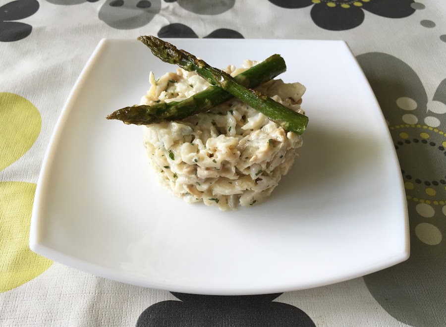 - Con ayuda de un aro metálico de emplatar, coloca dentro la merluza con alioli.