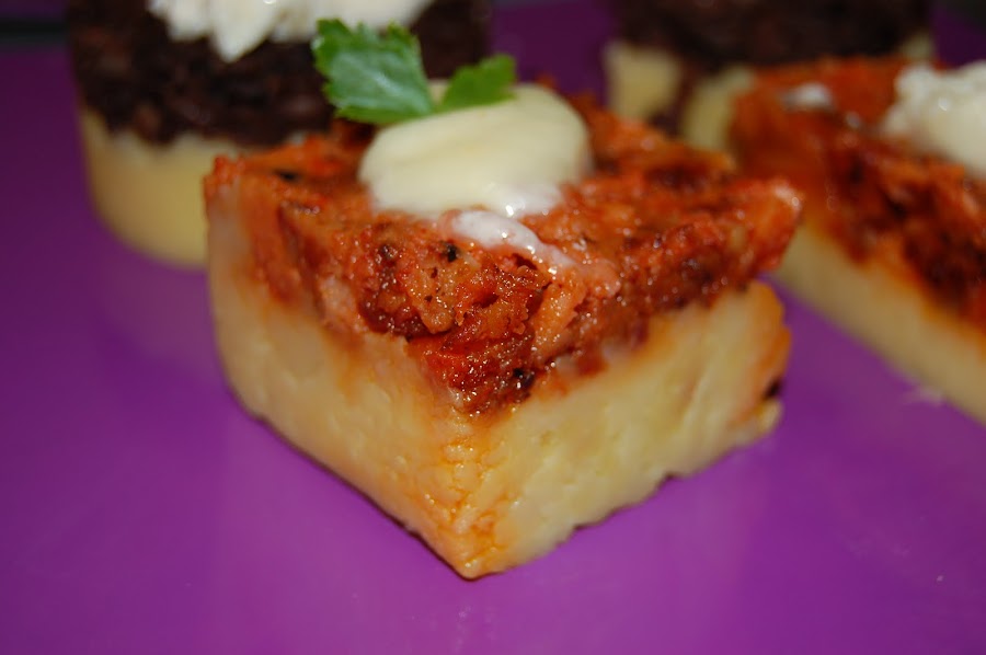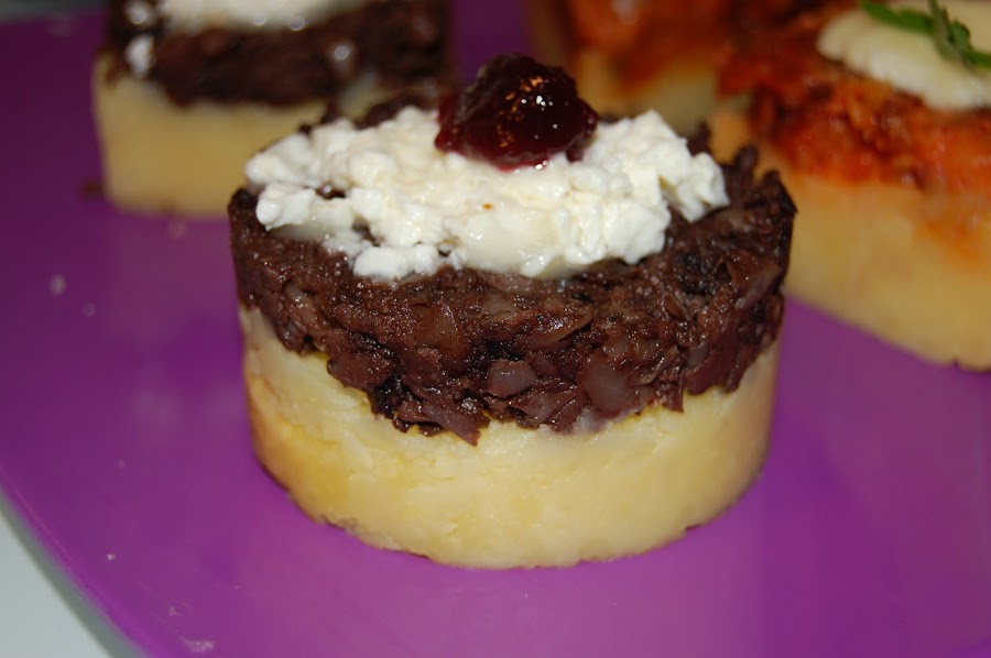 Llenamos los moldes que contienen la pasta de patata ,unos con chorizo y los restantes con la morcilla.