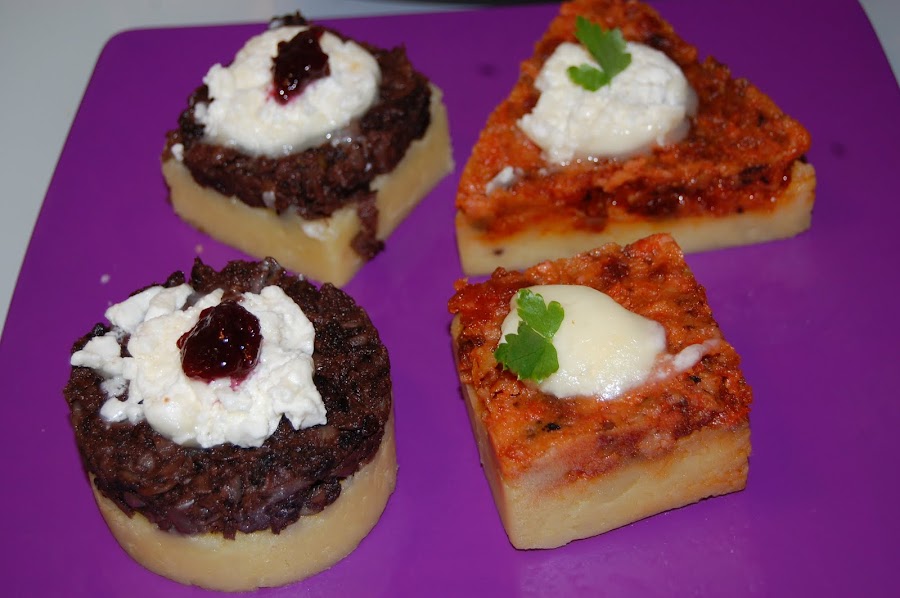 En los moldes que hemos puesto morcilla lo coronamos con unas gotas de mermelada de frambuesa o de tomate y en los de chorizo una hojita de perejil.