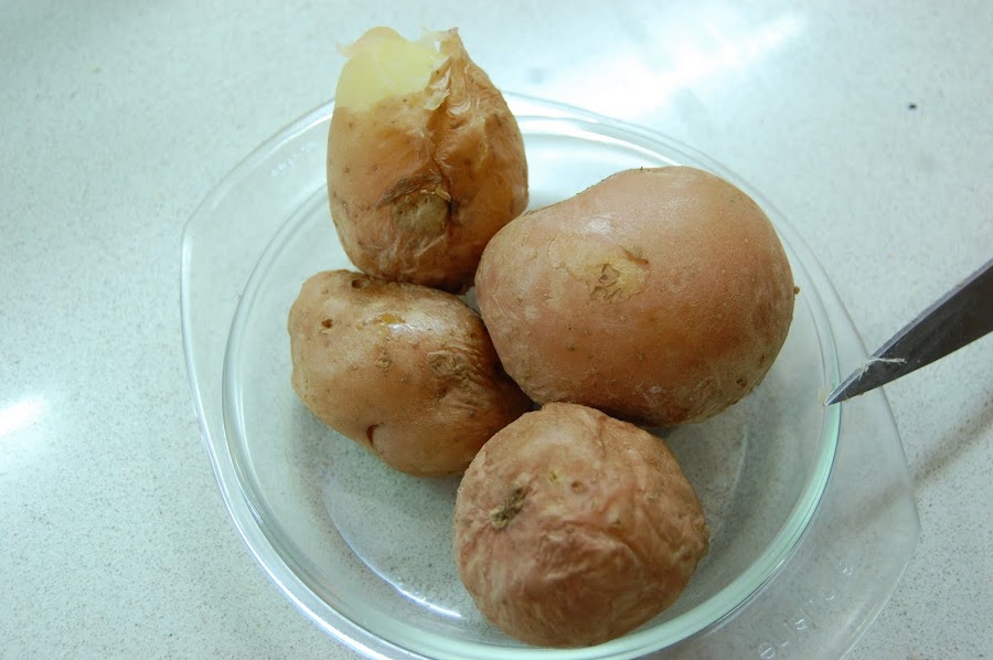 Lavamos las patatas,las pinchamos con la punta de un cuchillo para hacerle pequeños agujeros, las ponemos en un recipiente tapado apto para microondas y las cocemos 12 minutos a máxima potencia