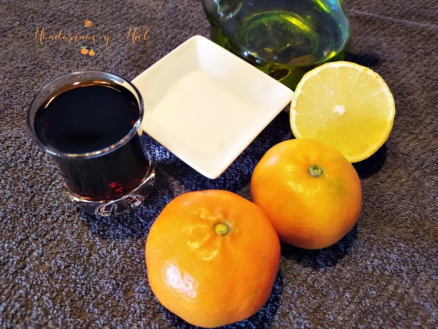 Pon los gajos de mandarina en un bol que pueda ir al microondas y añade el zumo de limón, el vino Pedro Ximenez, el azúcar y una pizca de sal.