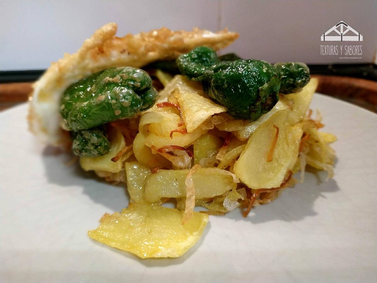 Emplatamos formando un timbal de base de patatas con la cebolla tierna, encima colocaremos los pimientos de padrón y por último el huevo frito con puntilla.