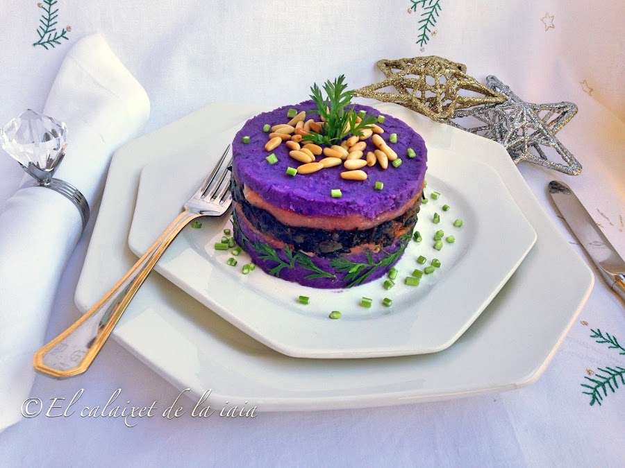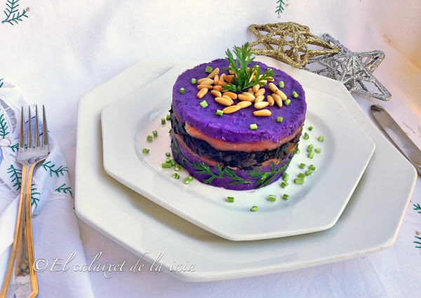 Colocaremos el aro de emplatar previamente engrasado en el plato de servir y pondremos una capa de puré de patata, una cortada de salmón, una capa de setas, otra capa de salmón y