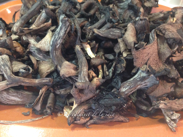 Limpiamos bien a fondo las trompetas de los muertos. Las setas no se ha de remojar en general, solo quitar la tierra con un cepillo y bajo de chorro, pero éste tipo de seta necesita una muy buena limpieza con el fin de eliminar bien la tierra. Escurrimos muy bien y troceamos.