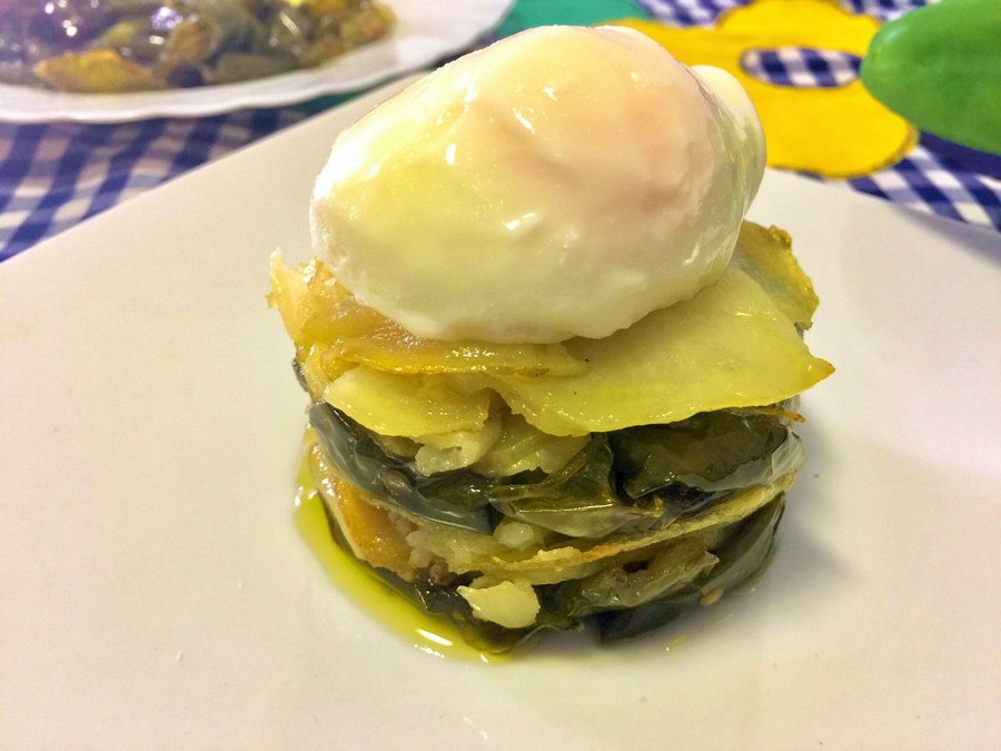 Montamos el timbal, yo utilizo un aro de emplatar, y coloco una primera capa de pimientos, otra de patatas, y así sucesivamente poniendo las capas que deseemos.