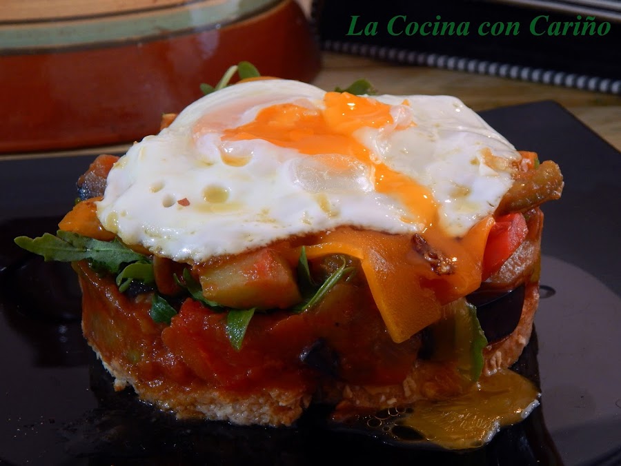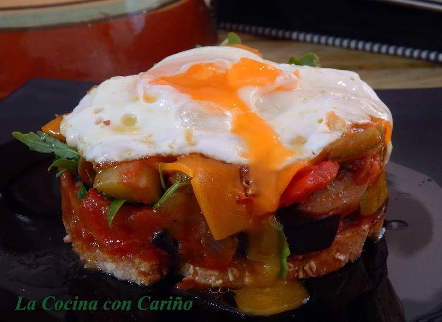 Montamos el plato. En la base ponemos el pan crujiente, una capa de pisto, otra de rúcula, otra de pisto, el queso Cheddar y el huevo. Y nuevamente la magia entró en mi cocina. Al menos eso dijo mi familia, y yo también lo pensé.