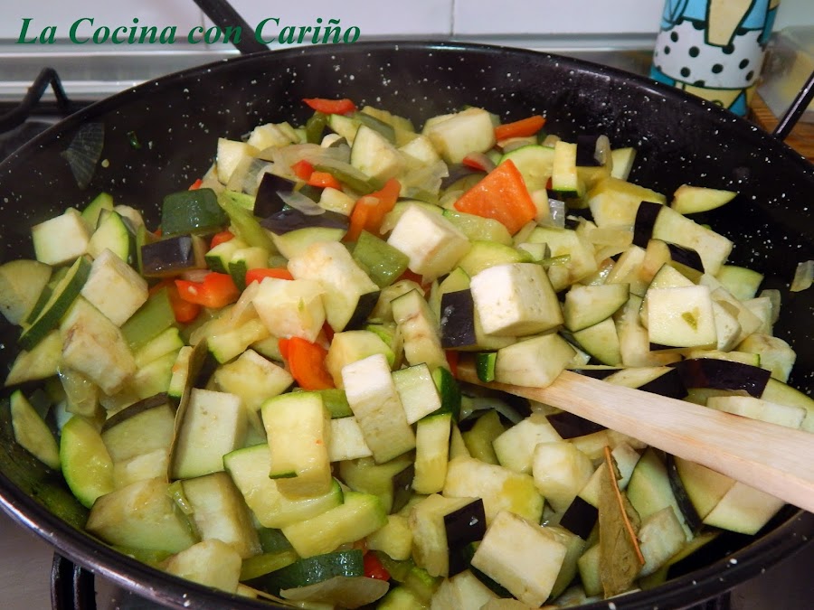 Pasados dos o tres minutos, ponemos los calabacines y un par de minutos después, las berenjenas. Todo lo iremos salpimentando a medida que vamos añadiéndolo. Tapamos y dejamos 5 ó 6 minutos a fuego lento y removiendo de vez en cuando. Ya sabéis que me gustan las verduras más bien al dente.