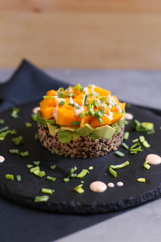 Este timbal de quinoa, mango y palta (aguacate) es un plato delicioso para sorprender cuando tenemos invitados en casa o simplemente para hacer un día que quieres disfrutar de un plato sabroso y ligero. Y es que además de ser súper sencillo de preparar es un plato lleno de frescura y color, y además saludable.Te propongo añadirle un toque de salsa de mayonesa picante para complementar y potenciar los sabores de esta riquísima preparación.