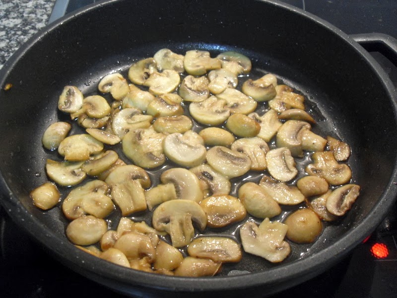 Limpiar, cortar y saltear los champiñones con poco aceite y caliente, añadir ajo bien picadito y sal.