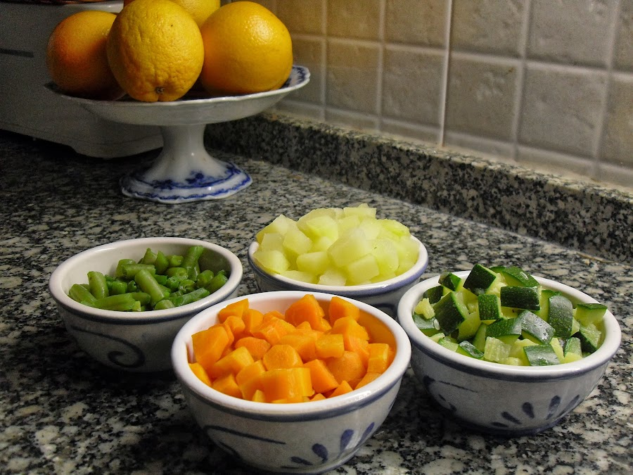 Lavar y cortar las verduras a cuadritos por separado.