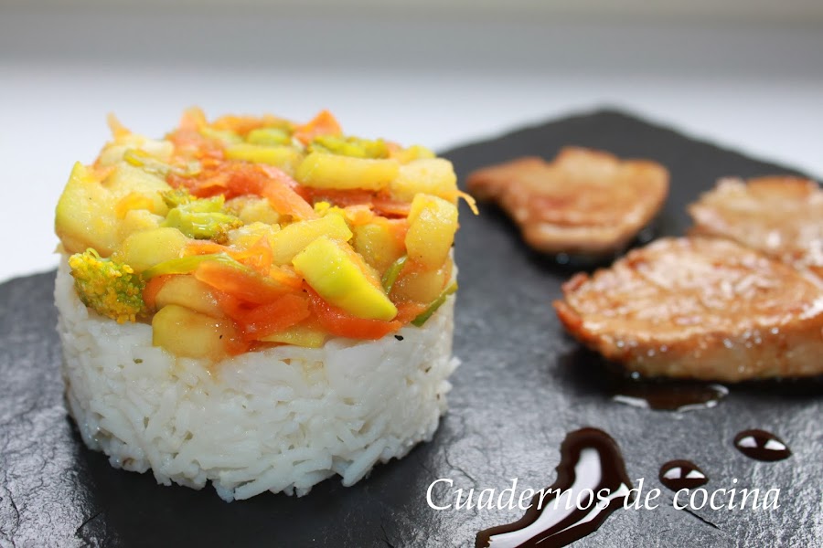 Montamos el timbal con ayuda de un aro de emplatar. Echamos arroz hasta la mitad del aro y completamos con el salteado de verduras. Retiramos el aro y servimos inmediatamente.