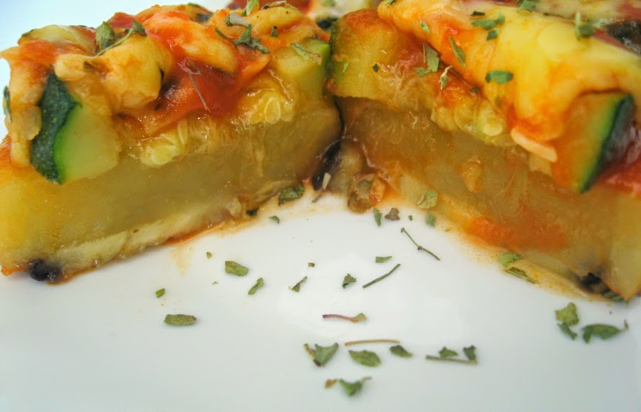 Cortar el calabacin y la patata de igual manera que la berenjena, sazonamos todo con sal y el azúcar, hacemos pequeñas torres con una rodaja de berenjena, encima una de patata y encima una de calabacin, puedes ponerlas en el orden que quieras, regamos pimienta negra por encima y una cucharadita de aceite de Oliva virgen, cerramos el Lekue y llevamos al horno por 6 minutos a máxima potencia.