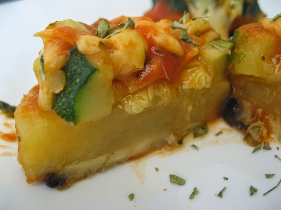 Sacamos del horno, comprobamos que este casi hecho, le regamos por encima la salsa de tomate o el tomate frito, echamos queso y orégano, llevamos al horno por un minuto mas. Servimos caliente.