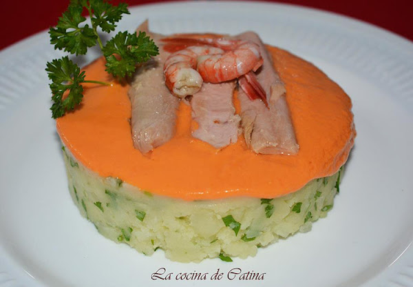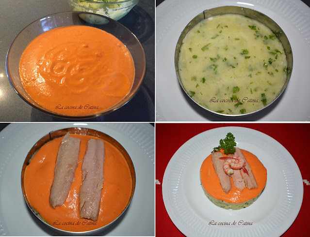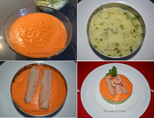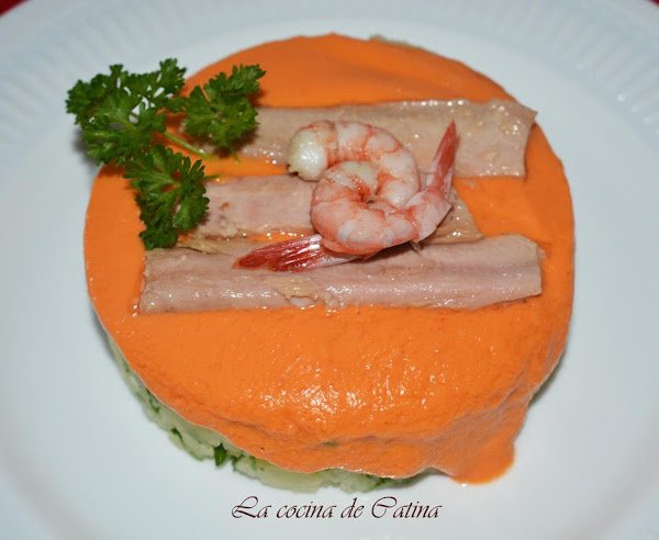 Repartimos para servir poniendo la mezcla anterior en un aro de repostería por comensal, presionamos con una cuchara la superficie un poco y desmoldamos. cubrimos cada timbal con salmorejo, añadimos la ventresca escurrida y las gambas y listo para servir.
