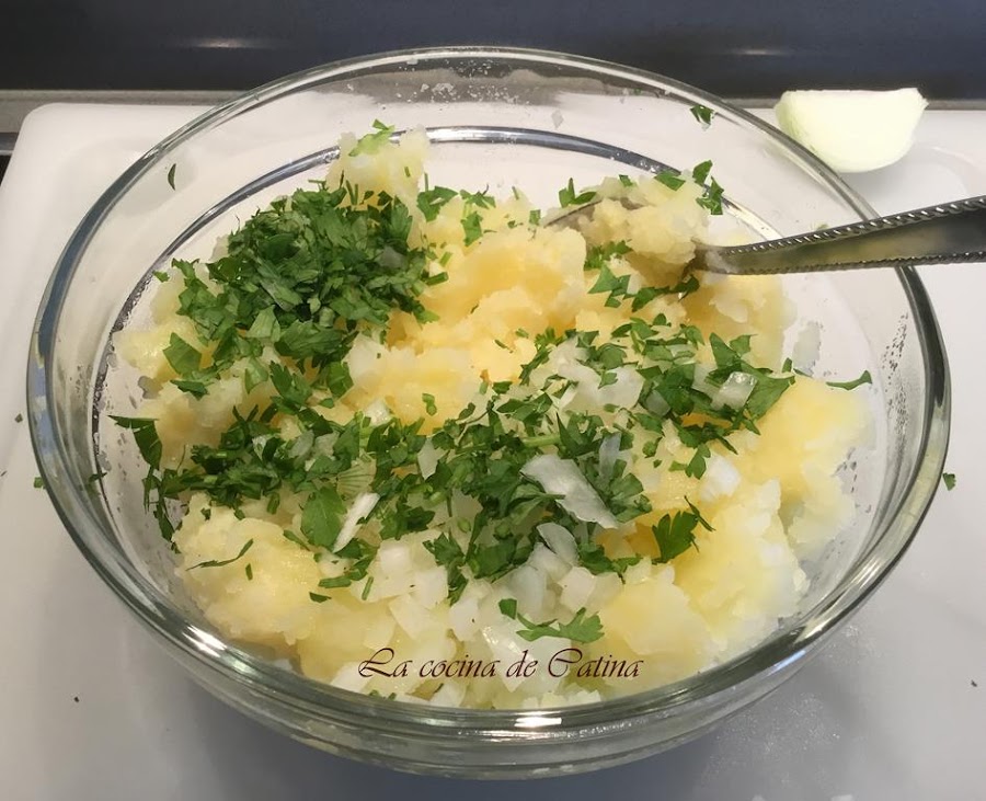 Limpiamos la cebolleta y la picamos con unas hojas de perejil lavadas. Lavamos las patatas y las cocemos en agua con sal durante 20 minutos, hasta que estén tiernas. Las escurrimos y las dejamos templar. Cuando enfríen un poco, las pelamos y las cortamos en rodajas, las mezclamos con la cebolleta y el perejil y aliñamos con una cucharada de vinagre de Jerez, 3 cucharadas de aceite de oliva y sal.