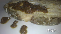 Pues dicho y hecho, una buena rodaja de tintorera a la plancha, cubierta de una sabrosa salsa de cebolla.
