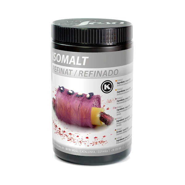 El isomalt es un edulcorante que proviene del azúcar mediante un proceso especial al que se somete a la remolacha azucarera. Es por lo tanto 100% natural, muy edulcorante pero con un contenido calórico menor que el del azúcar aproximadamente la mitad.