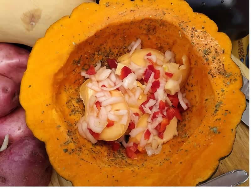 Yo lo ahueque, salpimiente, le puse queso fresco, un poco de cebolla y morrón perejil, luego lo envolví bien en papel de aluminio y lo puse directo sobre las brasas.