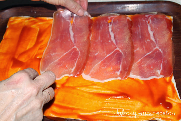 Cubrimos la lámina de hojaldre con tomate frito. Ponemos las lonchas de jamón encima.