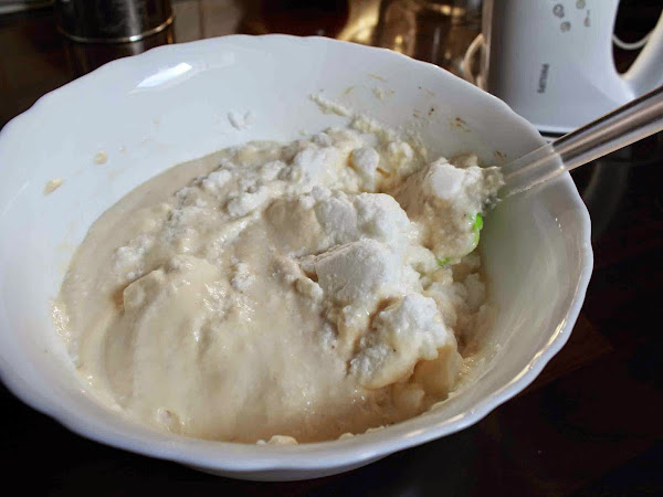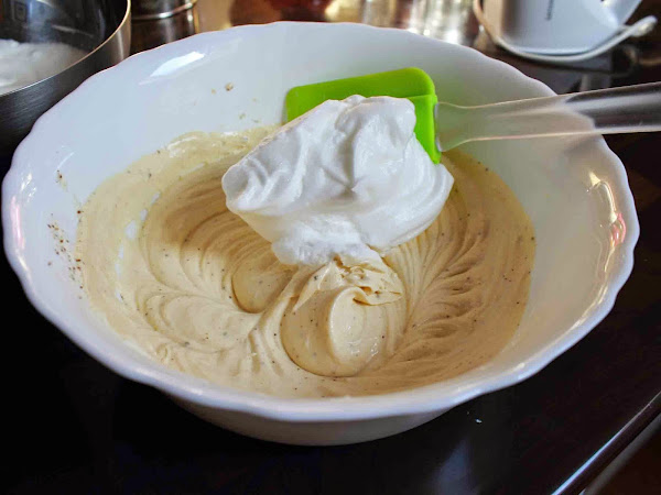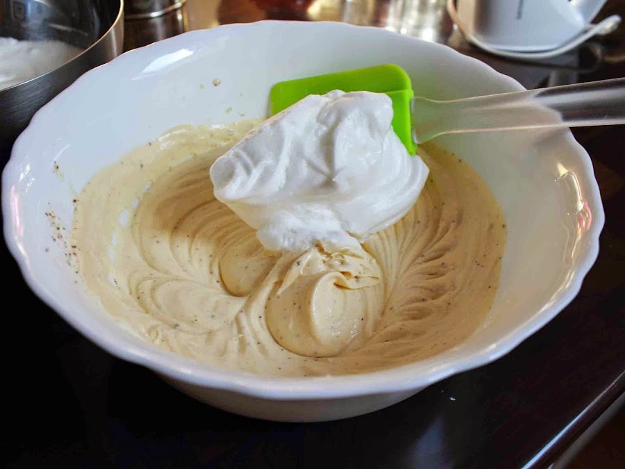 5. Incorporamos las claras montadas en varias tandas a la crema de mascarpone que teníamos en la nevera. Mezclamos suavemente con una espátula de silicona o una cuchara de madera de abajo hacia arriba. No hay que mezclar demasiado ni con mucha fuerza porque sino bajará la crema y quedará demasiado líquida.
