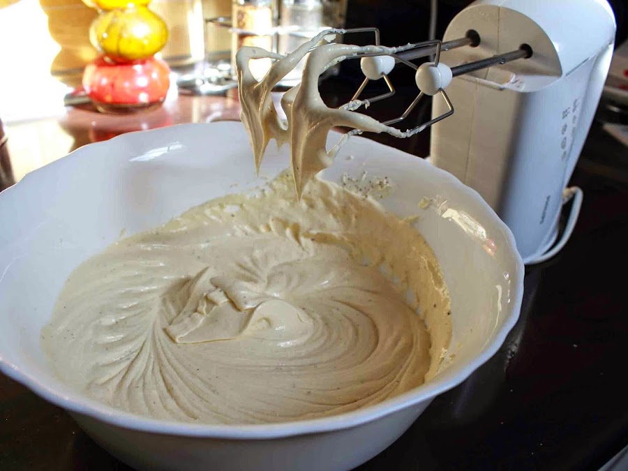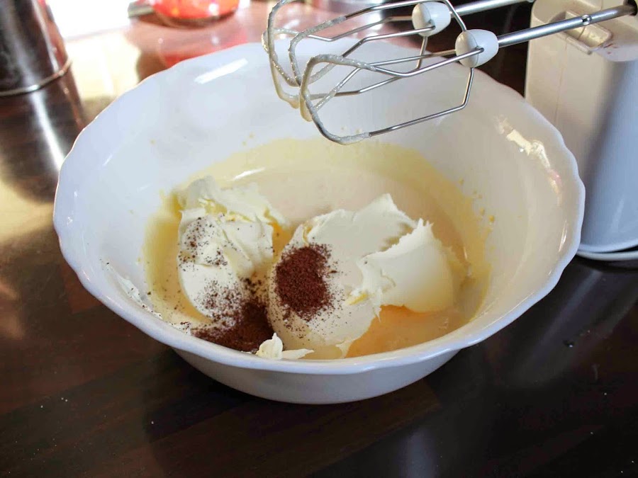 2. Añadimos el queso mascarpone y la cucharadita de café soluble y seguimos batiendo hasta que se integren bien. Conseguimos una crema densa.