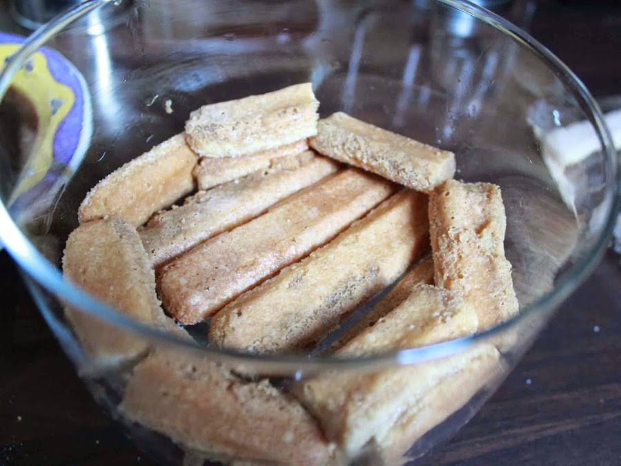 1. Primero empapamos ligeramente parte de los bizcochos de soletilla en el almíbar de café (no mojarlos demasiado ya que absorben bastante) y ponemos una primera capa en el fondo del recipiente.
