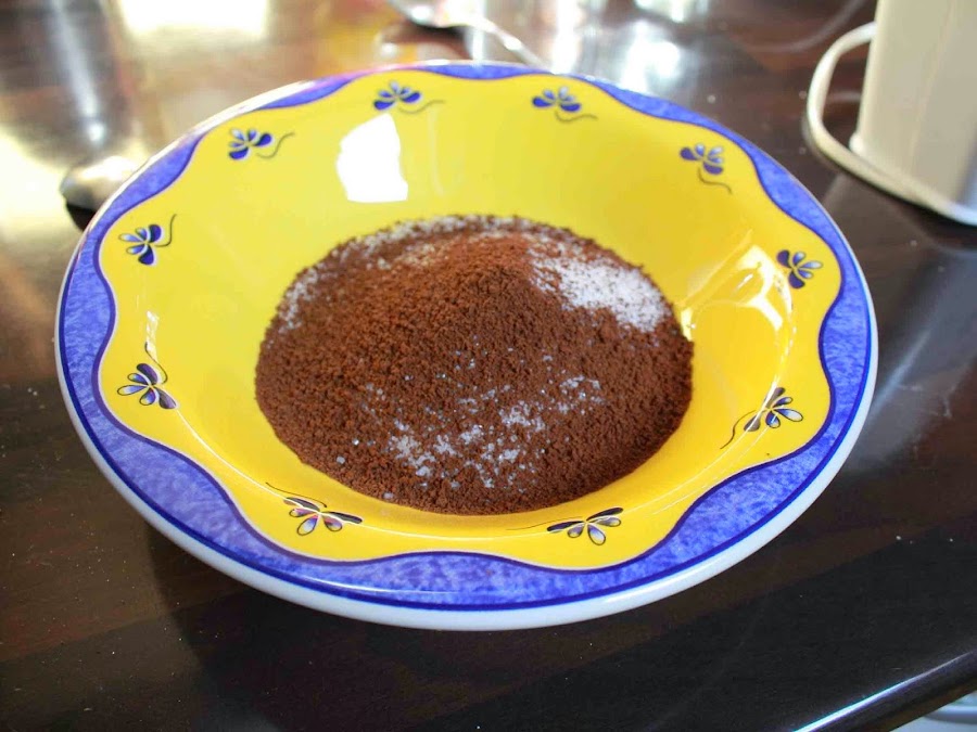 A la hora de presentarlo, lo espolvoreamos con generosidad con cacao en polvo sin azúcar (nos ayudamos con un tamizador pequeño y fino). Yo he decorado también con unas hojas y granos de chocolate. Para ello, fundimos el chocolate negro al baño maría y rellenamos un molde de hojas y otro de granos de café con el chocolate fundido. Guardamos el la nevera hasta que se endurezcan y desmoldamos.
