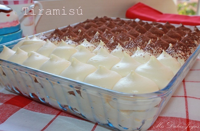 El tiramisú es un postre frío de cuchara que se monta en capas. Son capas alternas de bizcochitos soletilla o savoiardi (humedecidos en café) y crema de queso mascarpone. Una vez montado se deja asentar durante unas horas en el frigorífico, antes de ser servido. Se sirve bien frío y espolvoreado con cacao en polvo.