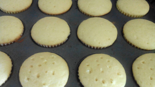Cuando estén listos, los sacamos del horno y dejamos enfriar. Y con un tenedor o palito de madera le hacemos agujeritos en la superficie para poder colocarles el baño y que se absorba bien.