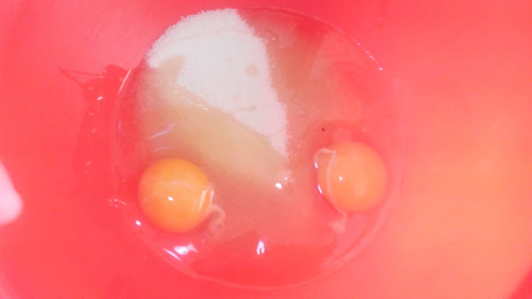 Comenzamos batiendo los huevos junto con el azúcar, la vainilla y el aceite hasta que estén pálidos y espumosos.
