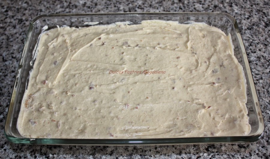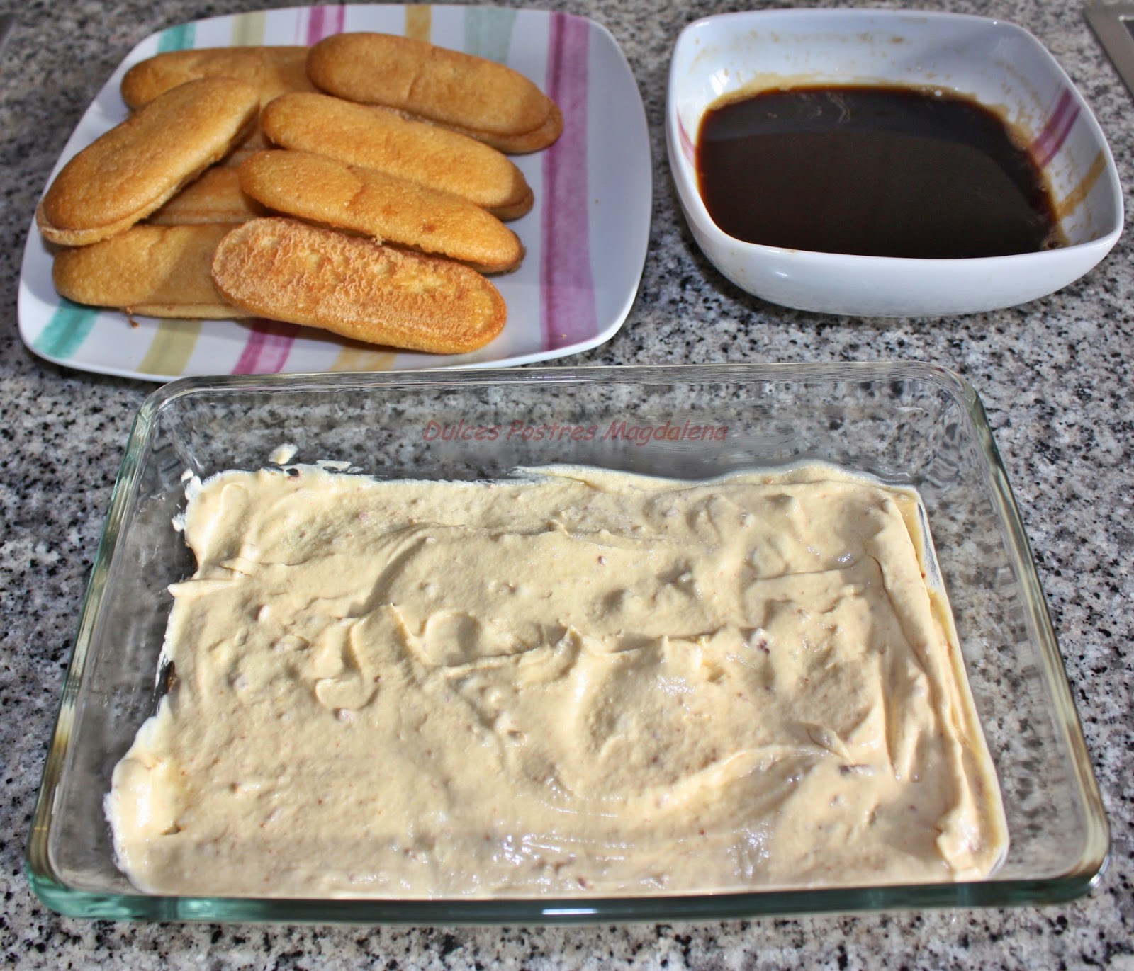 Comenzar a montar el tiramisú: Pasar los bizcochos por la mezcla del café y colocar en la bandeja, añadir la mitad de la mezcla de la crema, colocar de nuevo bizcochos y terminar con la mezcla de la crema.