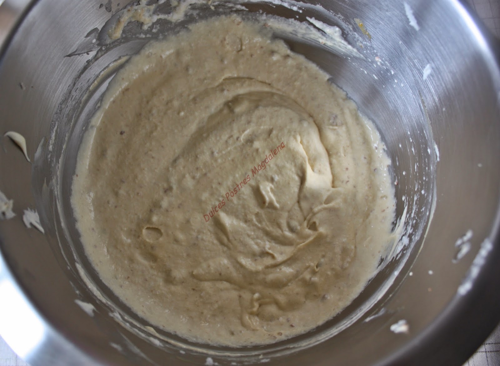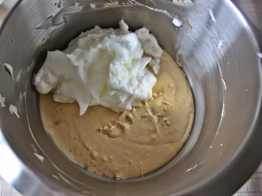 Por otro lado, batir las claras de huevo a punto de nieve, incorporarlas a la mezcla anterior con la ayuda de una espátula muy suavemente para que no bajen las claras.