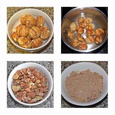 En primer lugar vamos a preparar la crema de castañas: pelar las castañas, cocerlas, una vez estén bien cocidas, dejar enfriar y pelar. Con la ayuda de un tenedor, aplastar y le añadir una cucharada de leche, hasta obtener una mezcla cremosa. Reservar