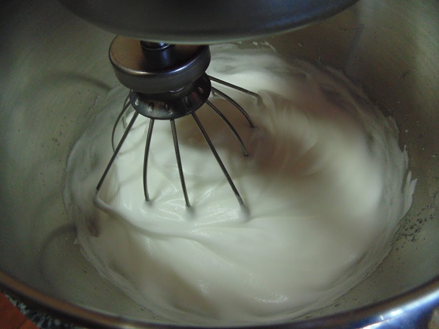 Comenzamos montando las claras con la mitad del azúcar (60 gramos) hasta obtener la consistencia de picos de nieve. Reservamos en la nevera.