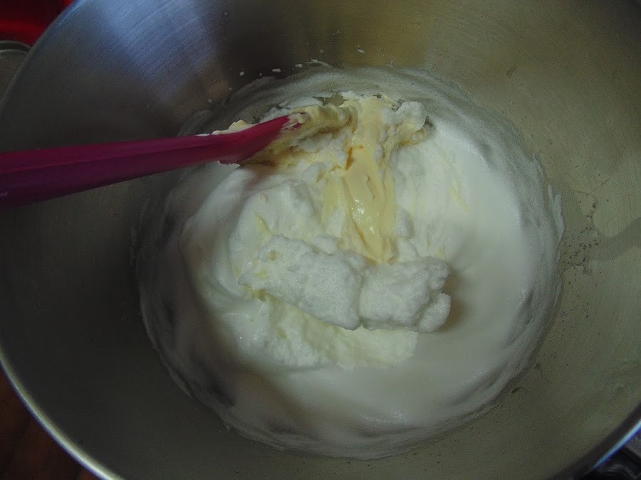 Para obtener la crema final de nuestro tiramisú, mezclamos un poco de la crema de mascarpone con las claras montadas y luego vamos añadiendo el resto con movimientos envolventes hasta obtener una crema homogénea y aireada.