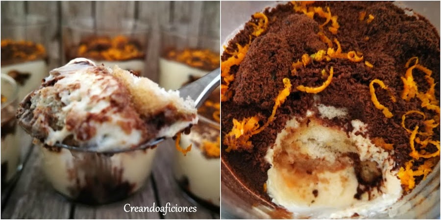 Por último, he mezclado zumo de naranja con el chocolate, he puesto un chorro por encima de la mezcla final de mascarpone y he troceado bizcochos y los he empadado en la mezcla de chocolate y naranja poniéndolos por encima, he rallado unas onzas de chocolate y he decorado con la ralladura de naranja.