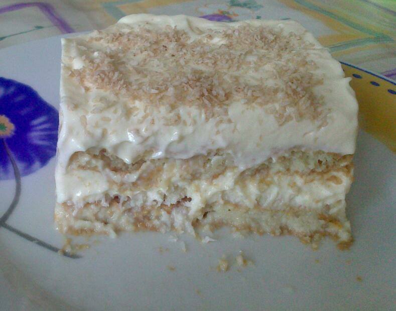 Tenía una tarrina de mascarpone y se me apetecía preparar tiramisú, pero como iban a comer los niños, decidí hacerlo pero sustituyendo el café. Pensé que con un toque de coco no quedaría mal, así que me puse a prepararlo y la pena es que preparé poco (sólo tenía una tarrina de 250gr) pues nos a encantado y no ha quedado para repetir. El procedimiento es igual al clásico, cambia solo con lo que empapamos los bizcochos.