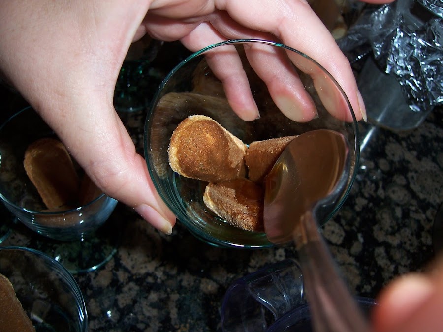 Ponemos los bizcochitos con la parte del azúcar hacia abajo en los moldes que vayamos a utilizar (en esta ocasión los pongo en copas individuales pero también se puede hacer en un molde grande) y los vamos bañando con el café, que queden bien mojados pero sin que rebose el café.
