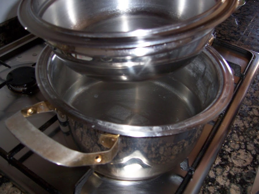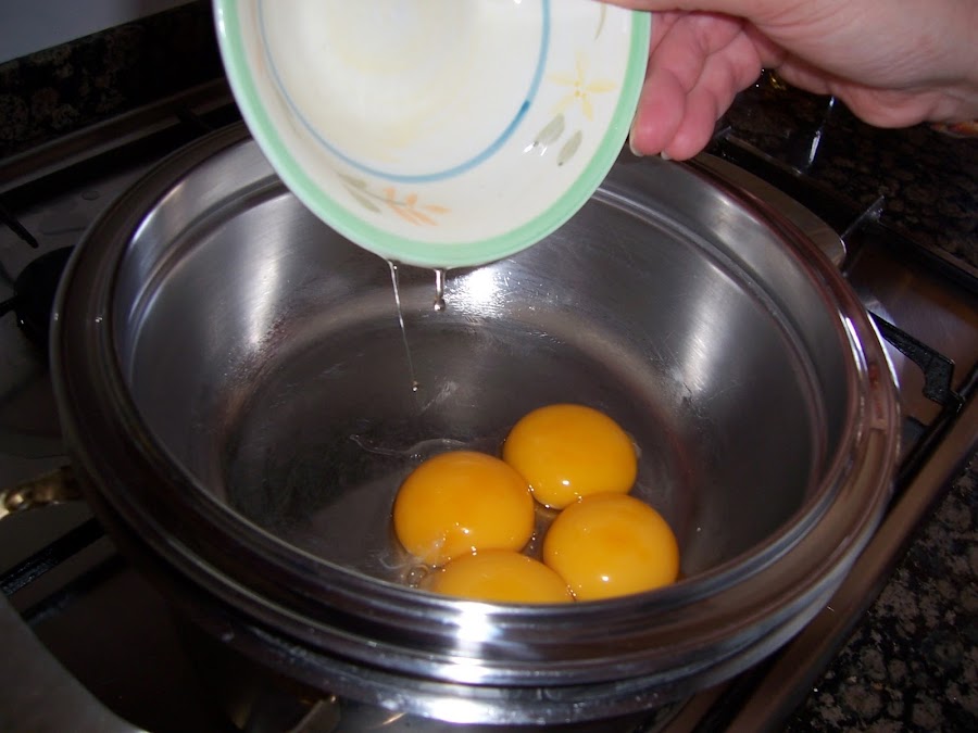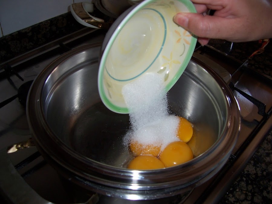 preparamos un baño maría poniendo a calentar una olla con agua y encima de ese agua un cuenco, donde pondremos las 4 yemas de huevo y los 20 g azúcar.