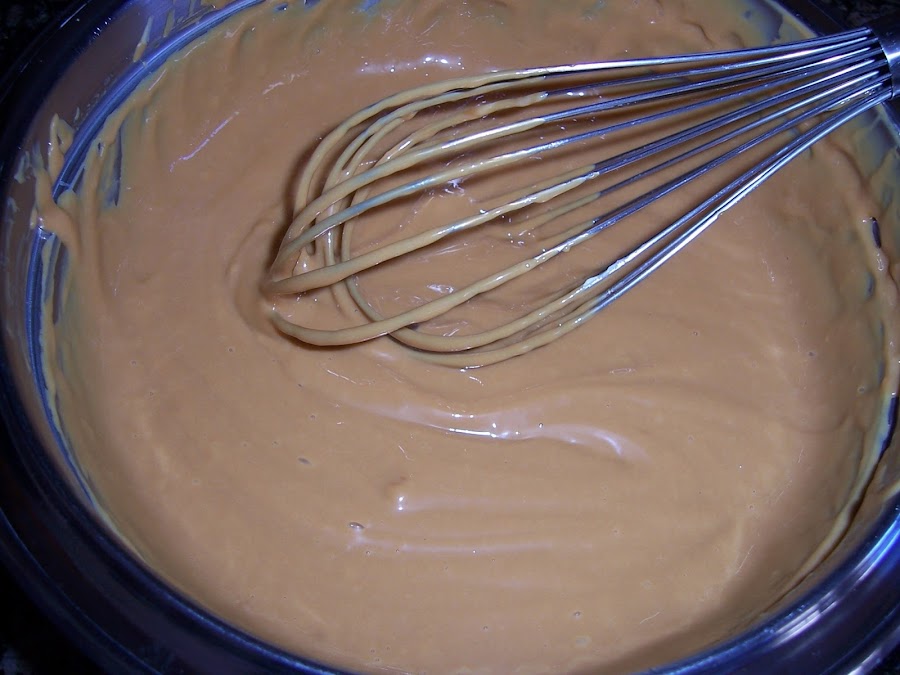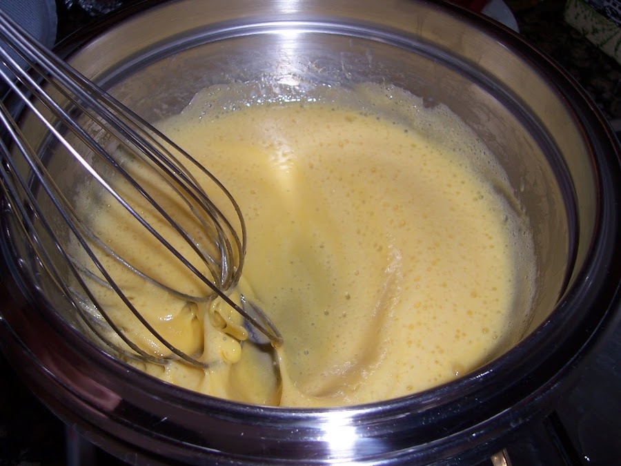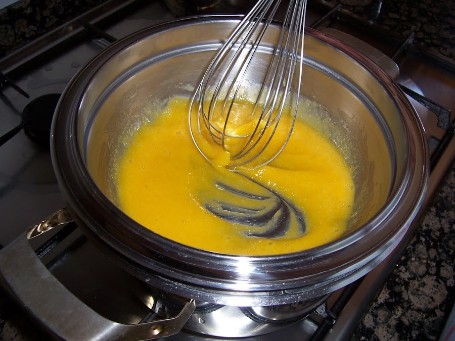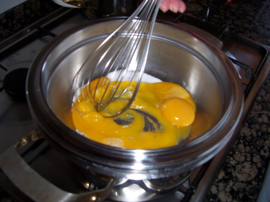 Empezamos a batir y vamos añadiendo el licor poco a poco sin dejar de batir, veremos como la crema poco a poco va cambiando de color y cogiendo cuerpo, entonces sabremos que está listo. Apartamos y dejamos enfriar.