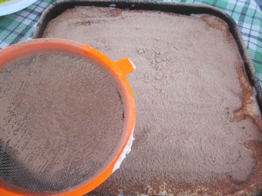 Con ayuda de un colador, espolvoreamos con el cacao y a reposar en la nevera.