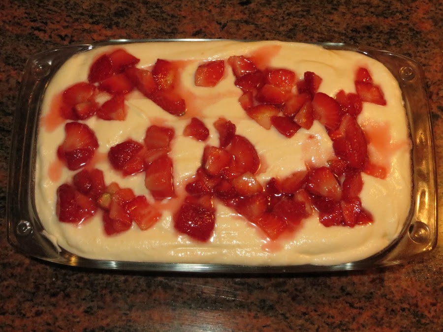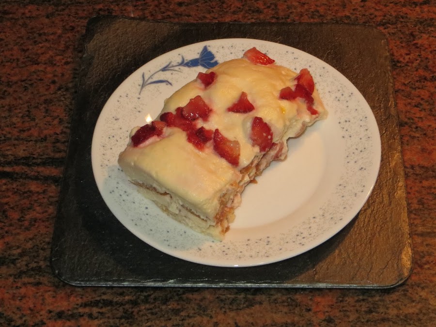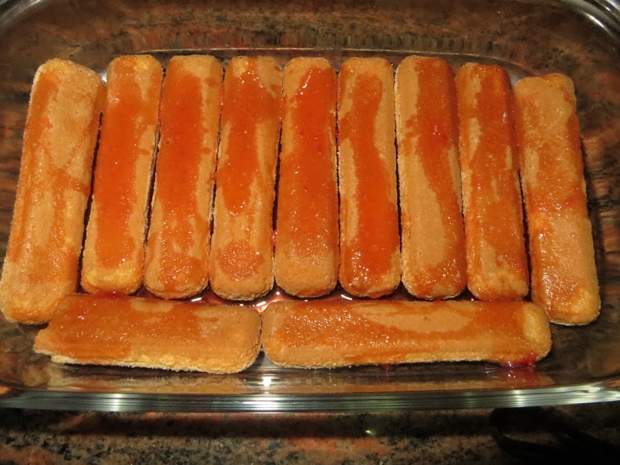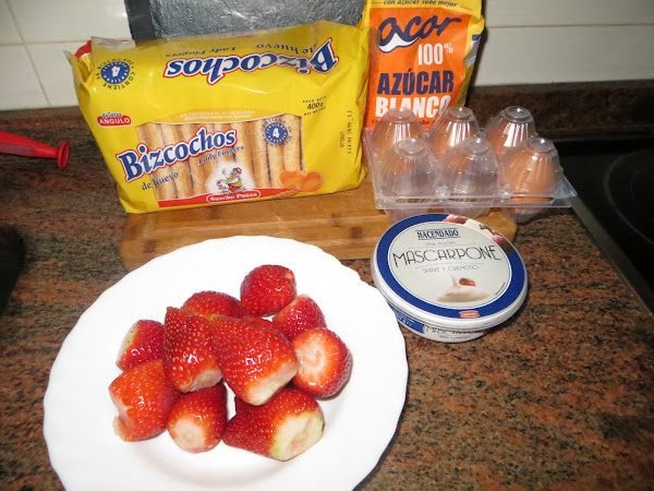 Ahora llega el momento de montar el tiramisú, colocamos en el fondo del recipiente una capa de bizcochos, echamos parte del sirope de fresas por encima. Colocamos una capa de la mezcla de huevo, azúcar y mascarpone y echamos parte de las fresas que habíamos partido. Ponemos otra capa de bizcocho (mojamos con el sirope que nos ha sobrado), la crema restante y echamos las fresas que nos han quedado. Lo metemos a la nevera hasta el día siguiente y ya está listo para comer.