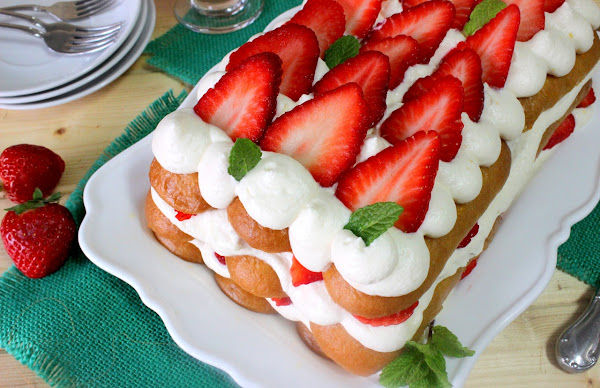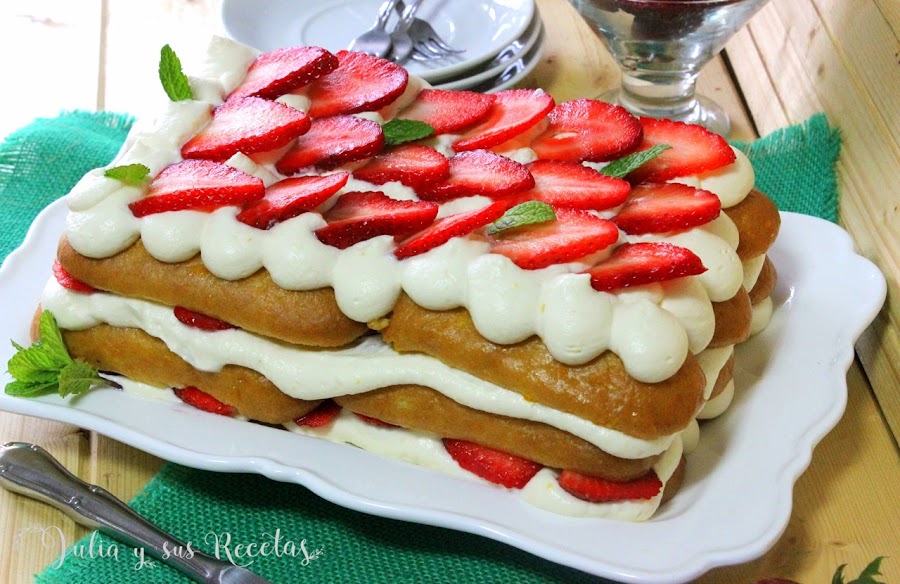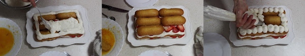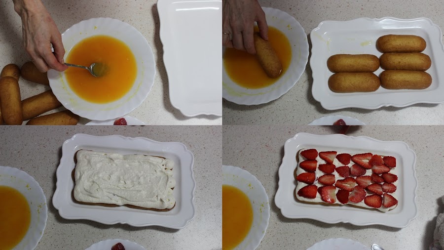 Colocamos una capa de bizcochos, una capa de crema una capa de fresas en láminas , bizcocho, crema y fresas.